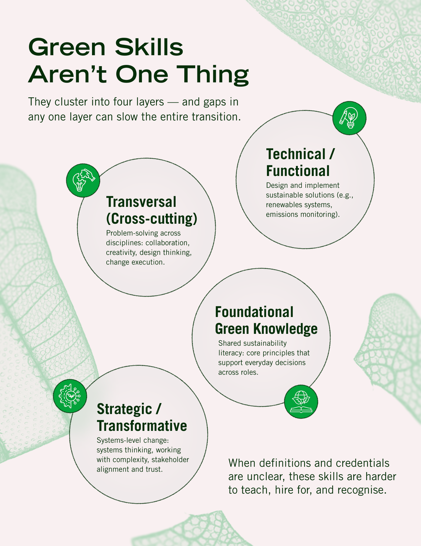 - Strategic or transformative skills: Vital for driving systems-level change and transformation. This includes skills like systems thinking or working with complexity, but also for stakeholder engagement, so that different people are able to co-create solutions, build credibility in a collaborative manner.