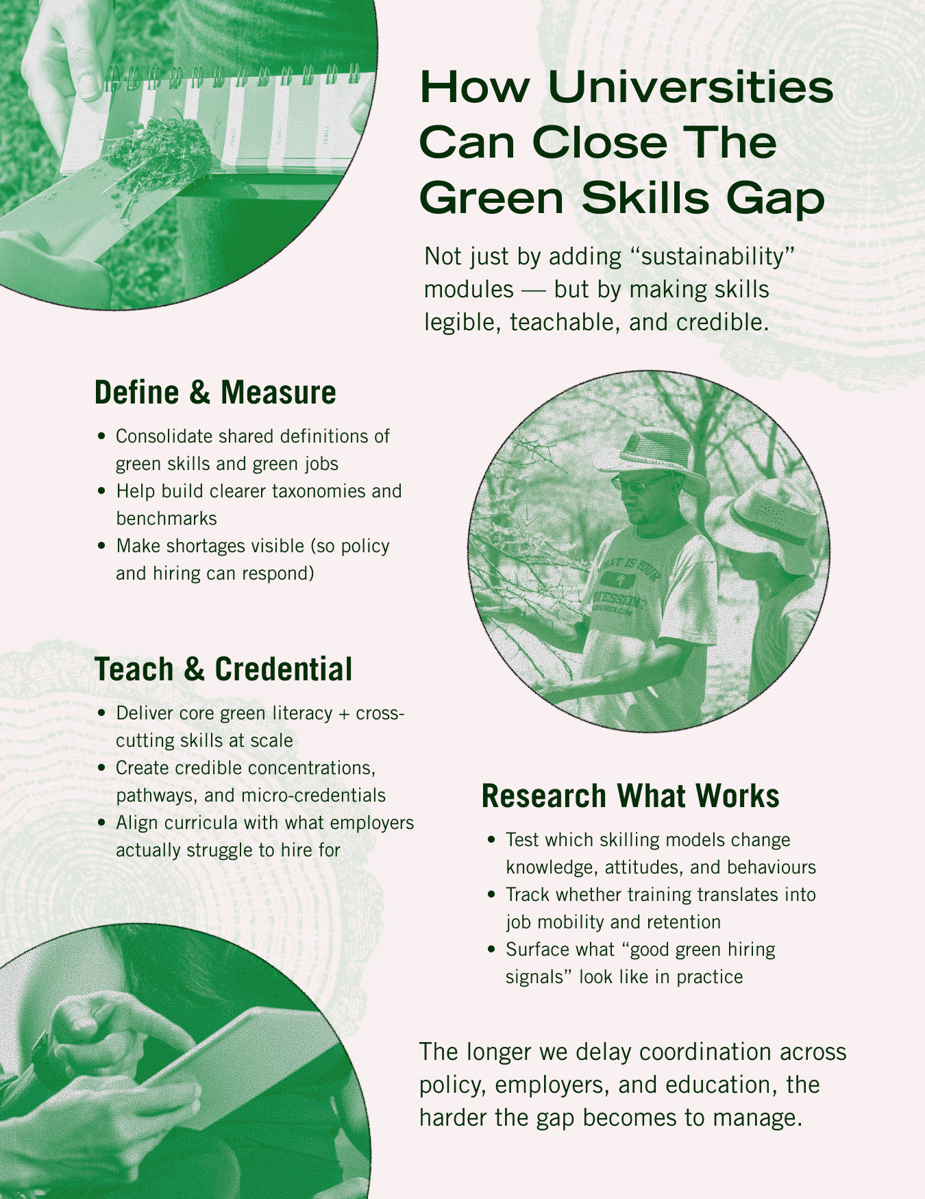“Green transitions are already well underway in many countries. Policymakers, employers and universities should be paying close attention to the green skills gap, because it is a loosely defined yet critically important policy priority that threatens to become unmanageable the longer we wait to address it.”