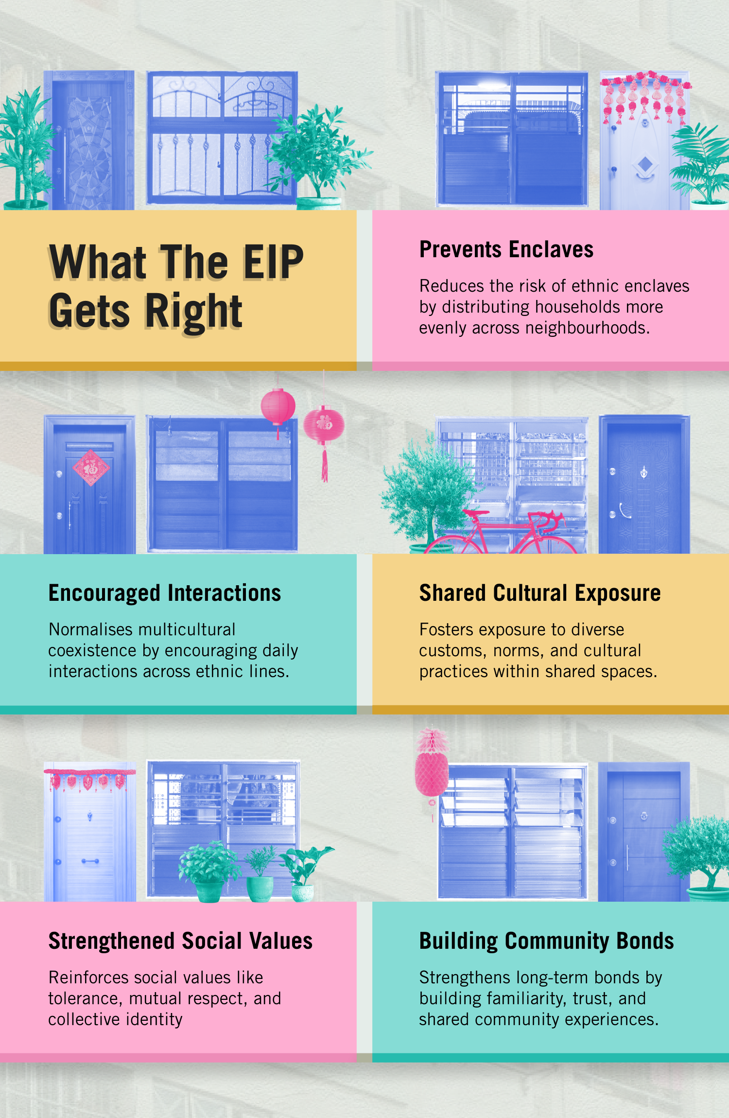 Introduced in 1989, the EIP aims to maintain a diverse mix of ethnicities in public housing estates, prevent the formation of racial enclaves, and encourage racial integration in Singapore. Implemented across all ethnic groups, the EIP sets limits on the percentage of a block or neighbourhood that can be occupied by a specific ethnicity.